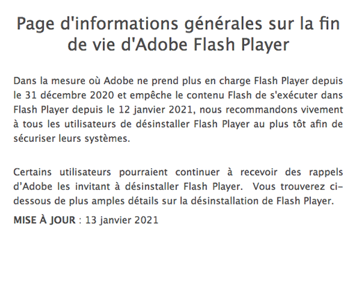 Installer Flash Player standalone Dans la procédure décrite ici vous allez installer une application sur votre ordinateur qui vous permettra de visionner des animations Flash téléchargées et pas directement dans un navigateur. La difficulté ici sera de trouver la version pour votre système d'exploitation, Mac ou Windows. Le maximum de versions seront listées sur ce site, avec des mises à jour régulières. Pour les ordinateurs Apple à processeur Mx, pour l'instant pas de Flash Player disponible. Un tableau est disponible en annexes selon les années et les versions de Flash Player. macOS / windows 10.1-10.3 / 98, ME et 2000 RTM-SP2 télécharger Flash Player 8 macOS / windows 10.5.7 - 10.6 / XP SP2 et Vista télécharger Flash Player 11 macOS 10.10 et plus télécharger Flash Player 32 |