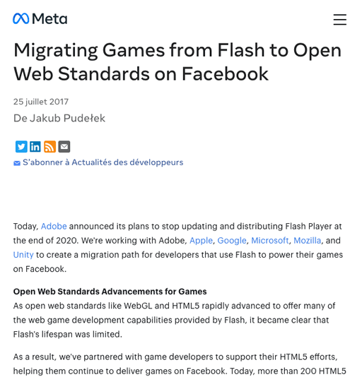 Installer Flash Player standalone Dans la procédure décrite ici vous allez installer une application sur votre ordinateur qui vous permettra de visionner des animations Flash téléchargées et pas directement dans un navigateur. La difficulté ici sera de trouver la version pour votre système d'exploitation, Mac ou Windows. Le maximum de versions seront listées sur ce site, avec des mises à jour régulières. Pour les ordinateurs Apple à processeur Mx, pour l'instant pas de Flash Player disponible. Un tableau est disponible en annexes selon les années et les versions de Flash Player. macOS / windows 10.1-10.3 / 98, ME et 2000 RTM-SP2 télécharger Flash Player 8 macOS / windows 10.5.7 - 10.6 / XP SP2 et Vista télécharger Flash Player 11 macOS 10.10 et plus télécharger Flash Player 32 |