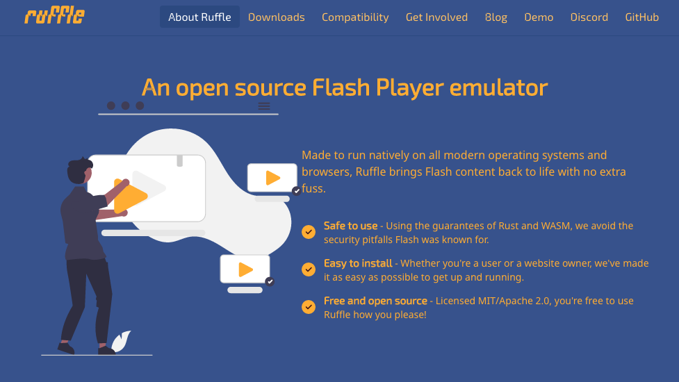 L'installation de Ruffle est relativement simple, pour cela il suffit de vous rendre sur la page de l'éditeur du logiciel. Sur la page d'accueil vous allez trouver deux options, soit installer une extension directement dans votre navigateur, soit télécharger une application sur votre ordinateur. Pour Chrome il vous suffit de choisir l'option proposée, pour Firefox il vous faudra aller dans "Others downloads"